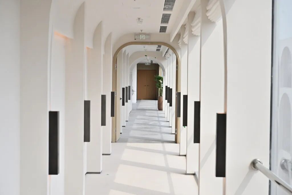 拱券式外观糅合东方美,复古而优雅,远远望去圆拱形落地窗如同一幅幅巨大画框,将窗外的绿树草坪和环球影城建筑巧妙地框入其中,定格成一幅幅美丽的画卷。“您再看一楼大堂里直通三楼的巨型罗马柱,艺术感是不是更强了?”廖陈斌介绍,这处艺术空间里足足设计了300多间客房。