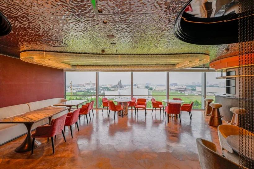 乘电梯来到八楼的落日餐厅。“今后不少游客都会率先来到八层,因为诺岚酒店将前台设在八层。”廖陈斌说。看看窗外风光就知道为何选在这里,正值傍晚时分,从八层落日餐厅看去,夕阳下,万物镀上金黄外衣,环球影城的哈利波特城堡、小黄人乐园等建筑在余晖里就像一幅灵动画作。当您一边品尝美食,一边观赏一路之隔环球影城的优美景色,听着环球影城内伴随着过山车起伏的欢笑声时,会觉得格外惬意而浪漫。“餐厅窗外最南边还有灰白色火山公园,有绿地草坪、滑板场地,以后会在这儿办各种室外活动,肯定特热闹。”廖陈斌说。当然,您也可以选择在无边泳池中运动打卡,或者就静静的看着窗外发会呆。